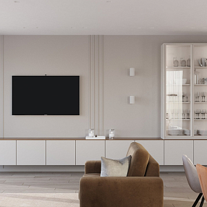 Интерьер спальни с панно за телевизором, стеной с телевизором, телевизором на рейках, телевизором на стене, нишей для телевизора и керамогранитом на стену с телевизором в современном стиле, проект «Уютный дом» №11