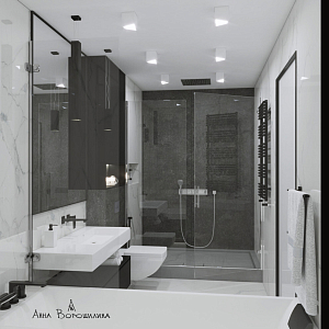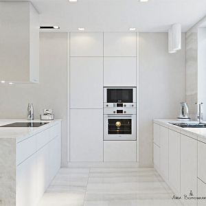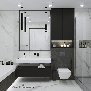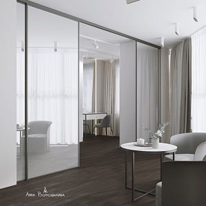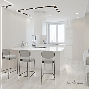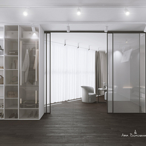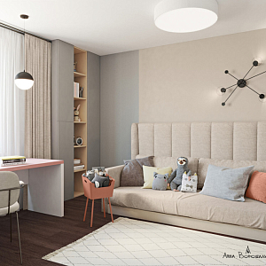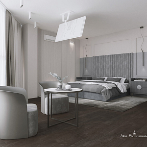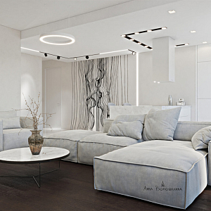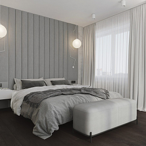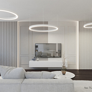 Интерьер гостиной с подсветкой настенной, подсветкой светодиодной, рейками с подсветкой, с подсветкой, светильниками над кроватью и световыми линиями, проект «Квартира с видом» №14