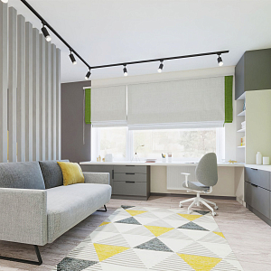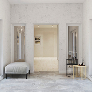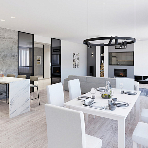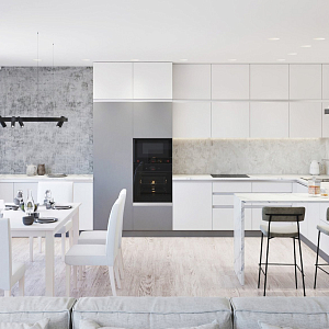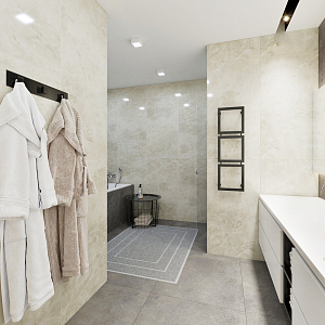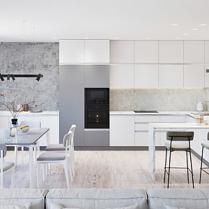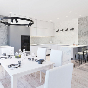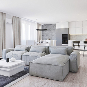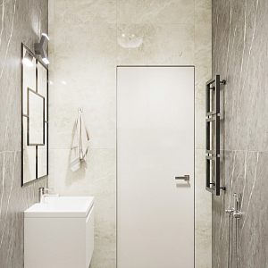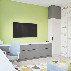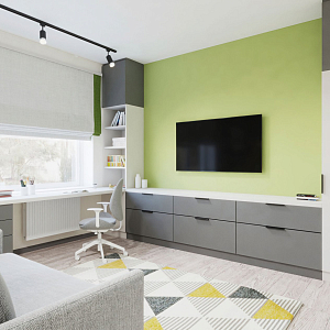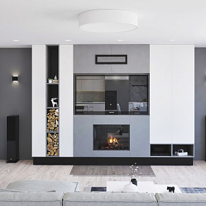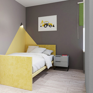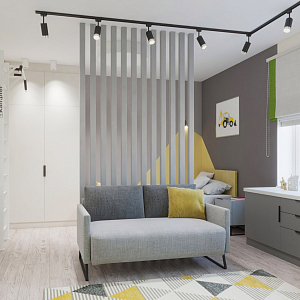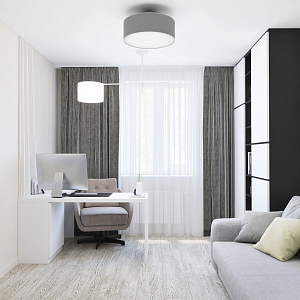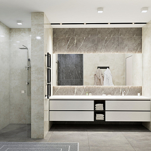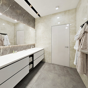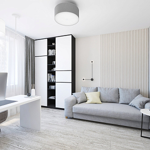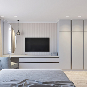 Интерьер спальни с подсветкой настенной, подсветкой светодиодной, рейками с подсветкой, с подсветкой, светильниками над кроватью и световыми линиями, проект «Monochrome house» №3