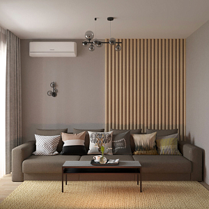Интерьер гостиной cветовыми линиями, рейками с подсветкой, подсветкой настенной и подсветкой светодиодной в современном стиле, проект «Трёхкомнатная квартира 67 кв.м.» №11