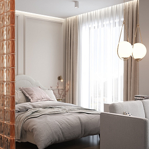 Интерьер спальни с перегородкой, зонированием, зонированием рейками и рейками с подсветкой в современном стиле, проект «Квартира в современном стиле в светлых тонах» №15