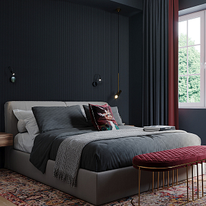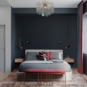 Интерьер спальни с подсветкой настенной и светильниками над кроватью в стиле фьюжн, проект «Спальня в таунхаусе» №5