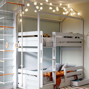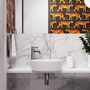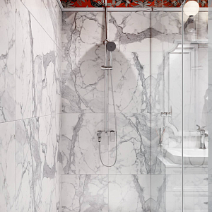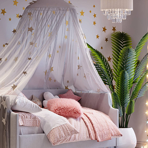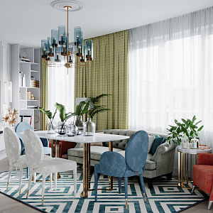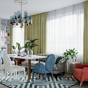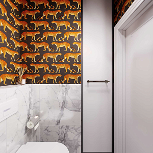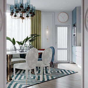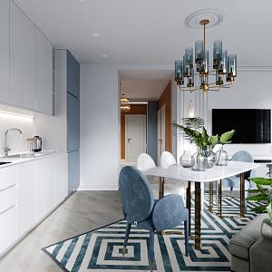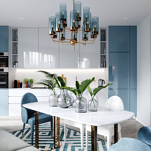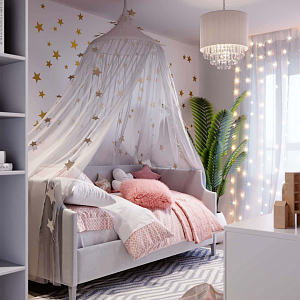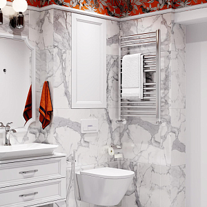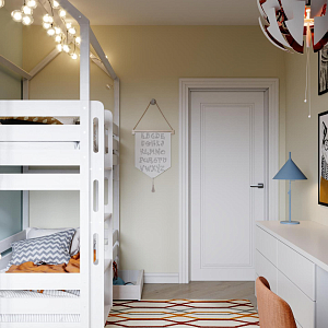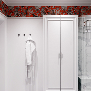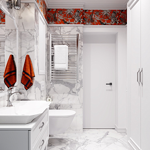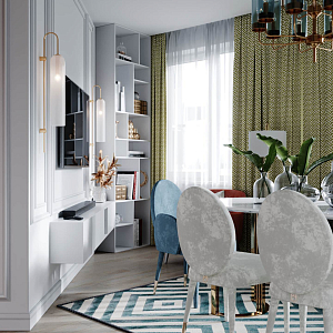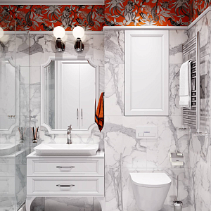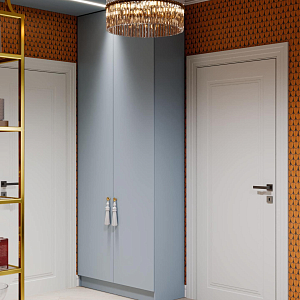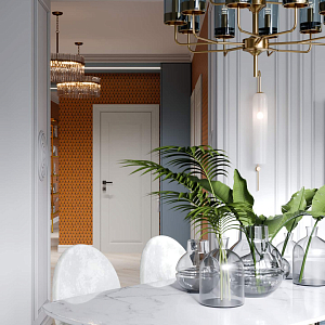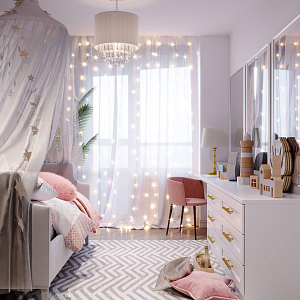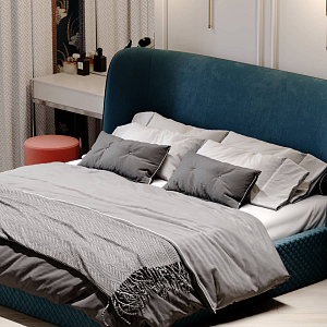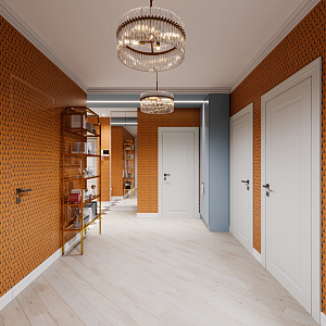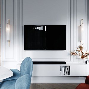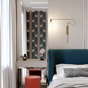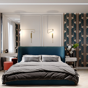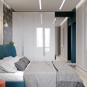 Интерьер спальни с нишей с подсветкой, подсветкой настенной, подсветкой светодиодной, рейками с подсветкой, с подсветкой, светильниками над кроватью и световыми линиями в неоклассике, проект «97м2 Флотилия» №13
