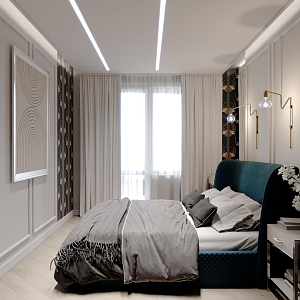 Интерьер спальни с нишей с подсветкой, световыми линиями, рейками с подсветкой, подсветкой настенной, подсветкой светодиодной, светильниками над кроватью и с подсветкой в неоклассике, проект «97м2 Флотилия» №27