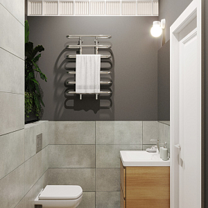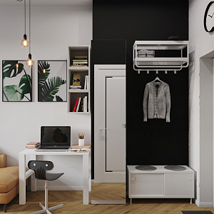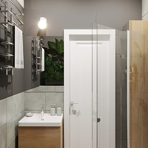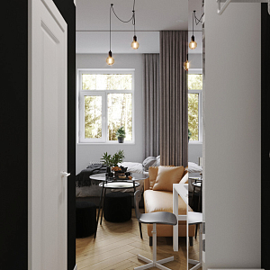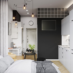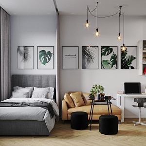 Интерьер cветовыми линиями, рейками с подсветкой, подсветкой настенной, подсветкой светодиодной, светильниками над кроватью и с подсветкой в скандинавском стиле, проект «18м2 Апартаменты Городские джунгли» №8