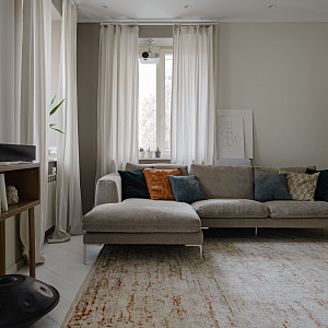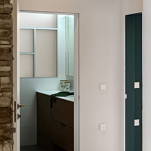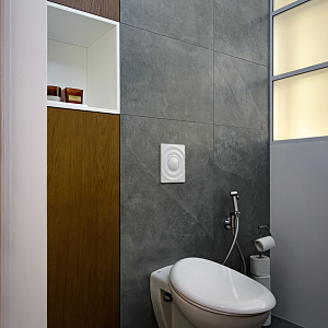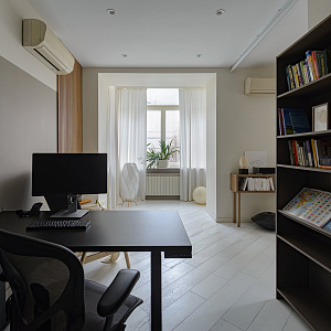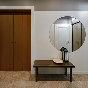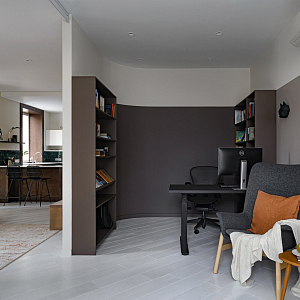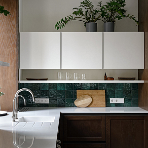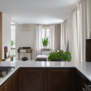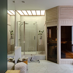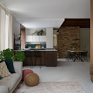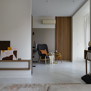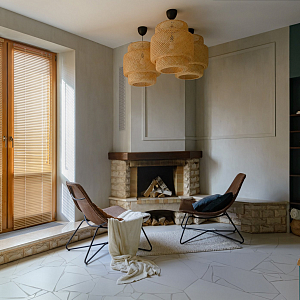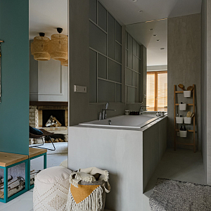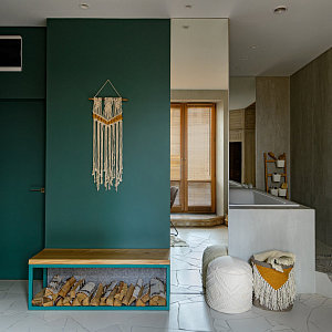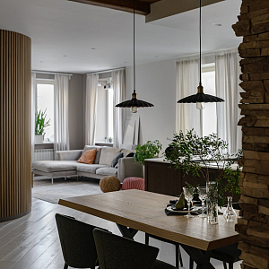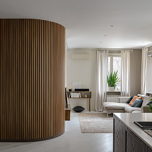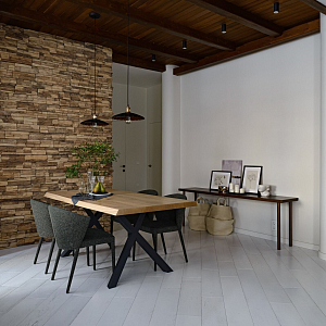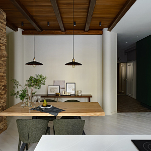 Интерьер столовой с в деревянном доме, вертикальными жалюзи, зонированием рейками, рейками с подсветкой и телевизором на рейках в средиземноморском, проект «110m2 Hidden Resort» №14