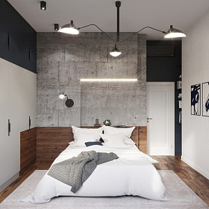 Интерьер с нишей с подсветкой, подсветкой настенной, подсветкой рабочей зоны, подсветкой светодиодной, рейками с подсветкой, с подсветкой и световыми линиями в стиле лофт, проект «88м2 GMTRY» №51