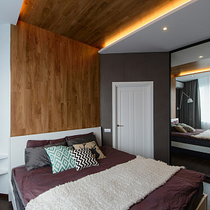 Интерьер с нишей с подсветкой, световыми линиями, рейками с подсветкой, подсветкой настенной, подсветкой светодиодной, подсветкой рабочей зоны и с подсветкой в современном стиле, проект «41м2 ЖК Оазис» №14