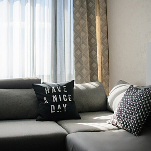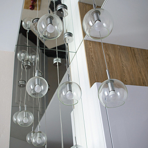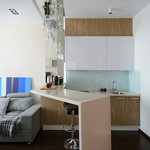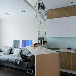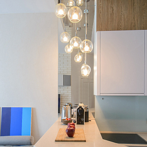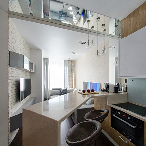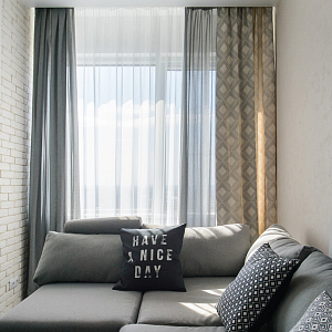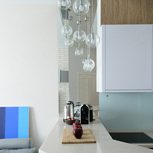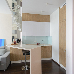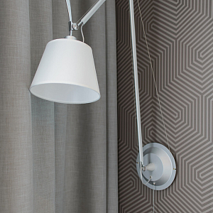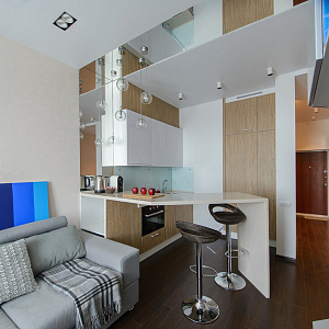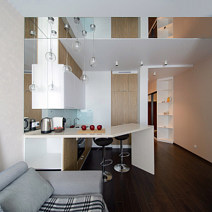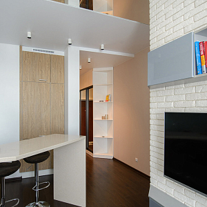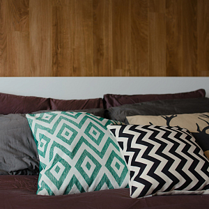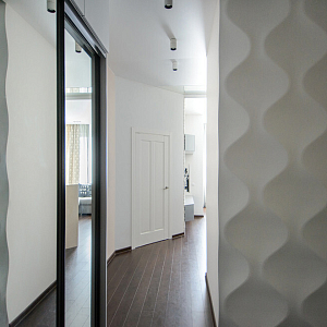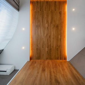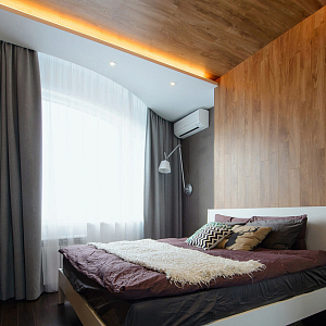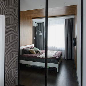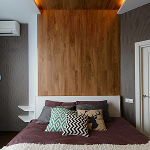 Интерьер спальни с подсветкой настенной, подсветкой светодиодной, рейками с подсветкой, с подсветкой, светильниками над кроватью и световыми линиями в современном стиле, проект «41м2 ЖК Оазис» №16