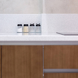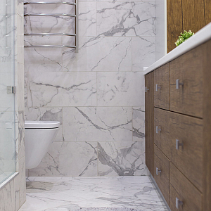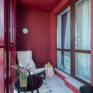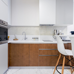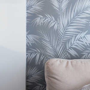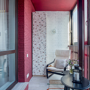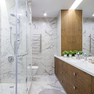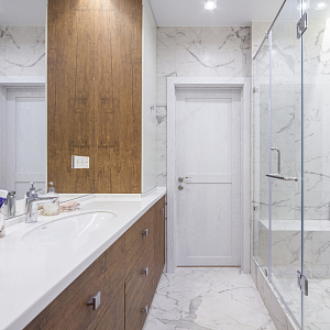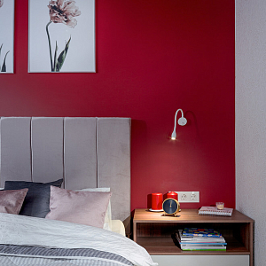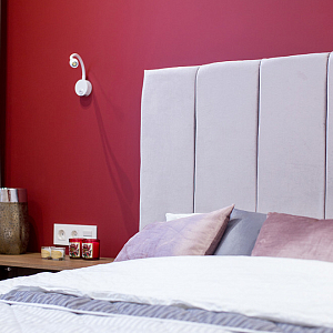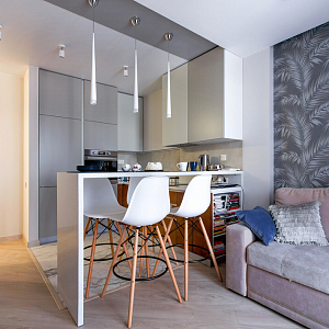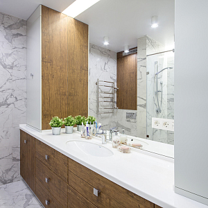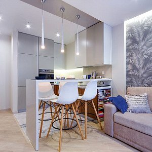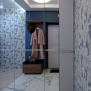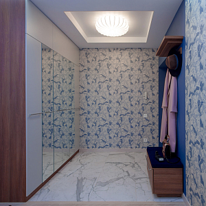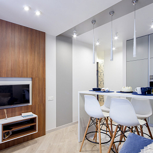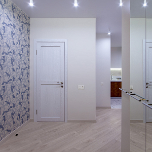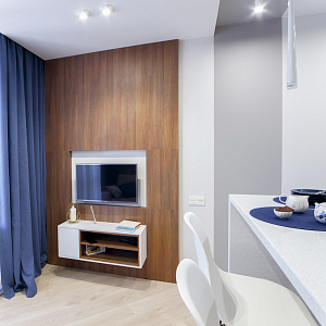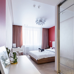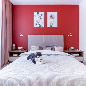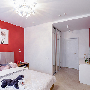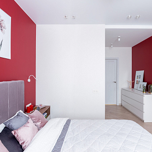 Интерьер спальни с подсветкой настенной, подсветкой светодиодной, рейками с подсветкой, с подсветкой, с рабочим местом и световыми линиями в современном стиле, проект «48м2 №23