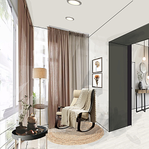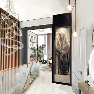 Интерьер прихожей с без дверей, входной группой, порогом, проходной и световыми линиями в современном стиле, проект «Холл в современном стиле с акварелями» №1
