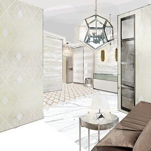 Интерьер прихожей с зеркалом на двери, проходной и световыми линиями в современном стиле, проект «Лофт в холле» №2