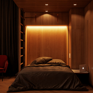 Интерьер спальни с нишей с подсветкой, сауной, рейками с подсветкой, подсветкой настенной, подсветкой светодиодной, светильниками над кроватью и с подсветкой в современном стиле, проект ««Green Green Mountain »» №29
