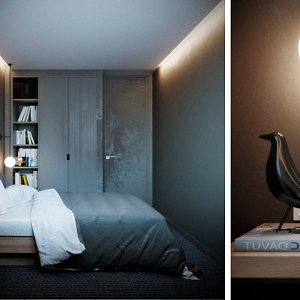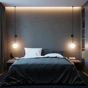 Интерьер спальни cветовыми линиями, бра над кроватью, подсветкой настенной, подсветкой светодиодной и светильниками над кроватью в скандинавском стиле, проект ««Сосны На Морском Берегу»» №13