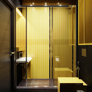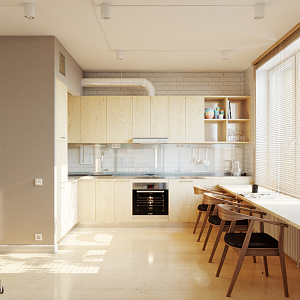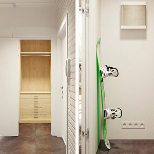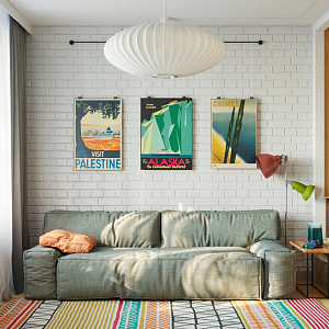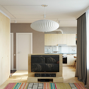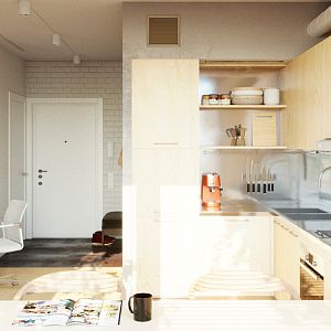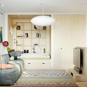 Интерьер с кроватью в нише, перегородкой, зонированием, без дверей, проходной, гостиной-столовой, проемом, с антресолью, open space и кроватью у двери в скандинавском стиле, проект ««Birch & Brick»» №10