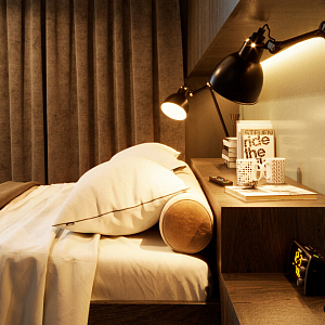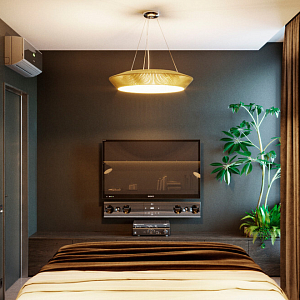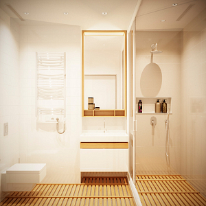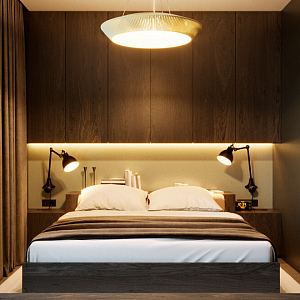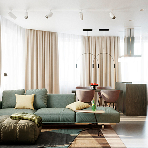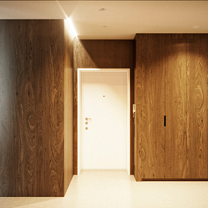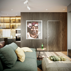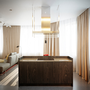 Интерьер кухни с подсветкой светодиодной, рейками с подсветкой, светильниками над столом и световыми линиями в стиле лофт и в современном стиле, проект ««Монохром»» №13