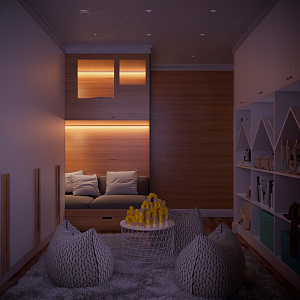 Интерьер с open space, без дверей, гостиной-прихожей, гостиной-столовой, зонированием, зонированием шторами, переговорной, подсветкой светодиодной, порогом, проемом, проходной, с кабинетом, сауной и световыми линиями в скандинавском стиле, проект ««Малышк №33