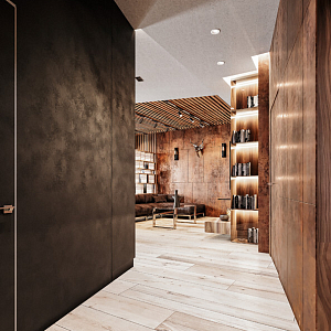 Интерьер спальни с подсветкой настенной, подсветкой светодиодной, рейками с подсветкой, с подсветкой, светильниками над кроватью и световыми линиями в стиле лофт, проект «Петровский пр. д5 ЖК «OSTROV» Квартира «Soft Loft»» №17