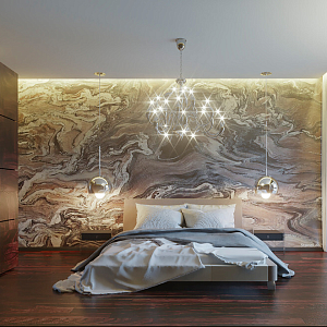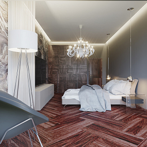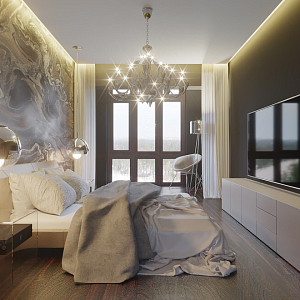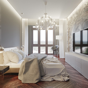 Интерьер спальни с подсветкой настенной, подсветкой светодиодной, с подсветкой и светильниками над кроватью в современном стиле, проект «Приморский пр., 52, «Лайф-Приморский»» №3