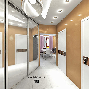 Интерьер с гостиной-прихожей, гостиной-столовой, кухней-гостиной с коридором, подсветкой светодиодной, проемом, проходной и с подсветкой в современном стиле, проект «Ул. Парашютная. Квартира 78.5м²» №11