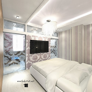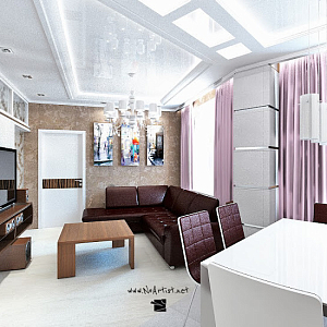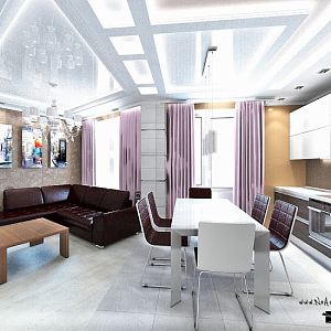 Интерьер коридора с проходной, световыми линиями, кухней-гостиной с коридором, порогом, подсветкой настенной и подсветкой светодиодной в современном стиле, проект «Ул. Парашютная. Квартира 78.5м²» №13