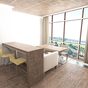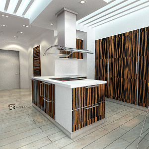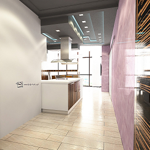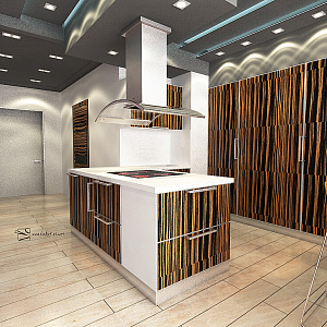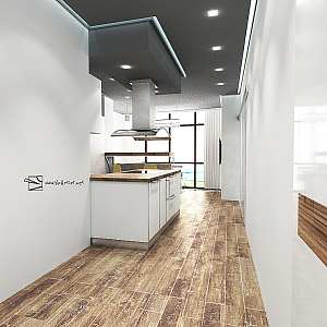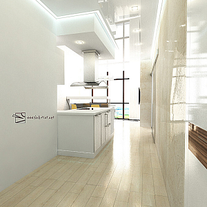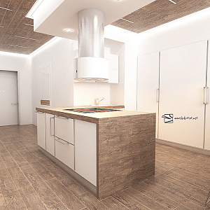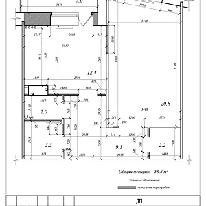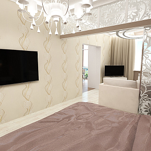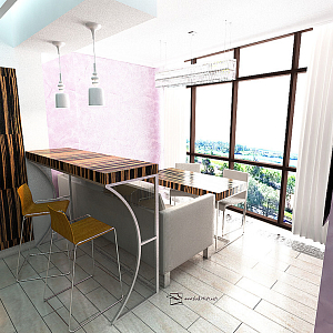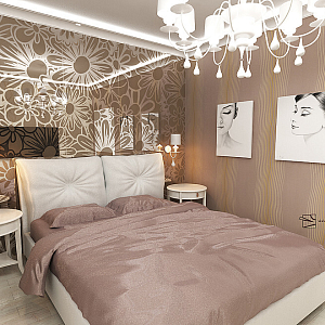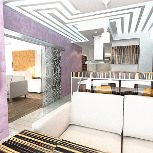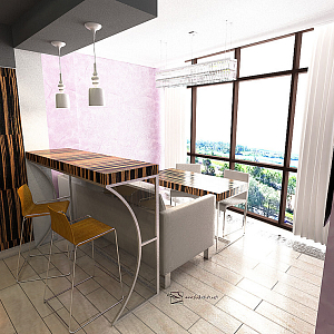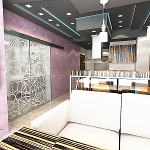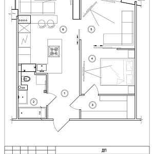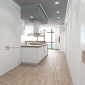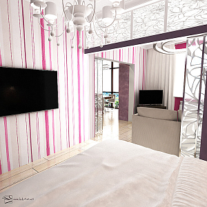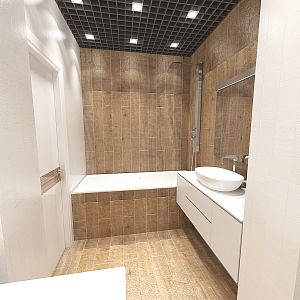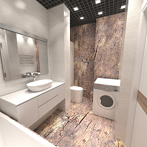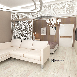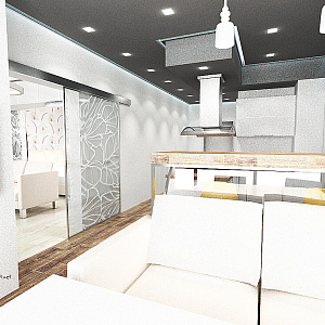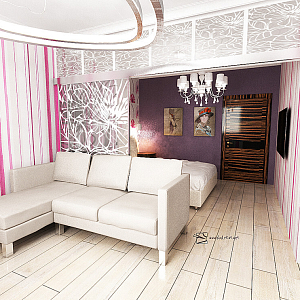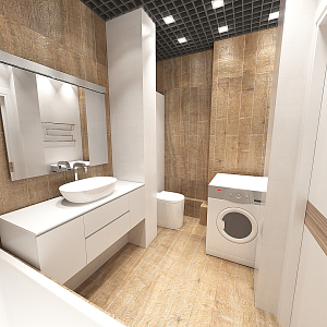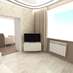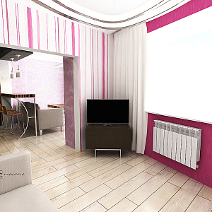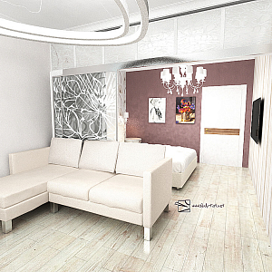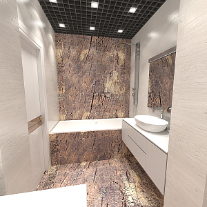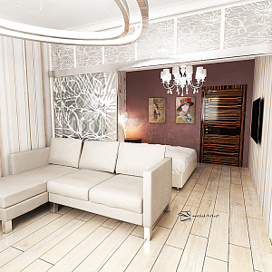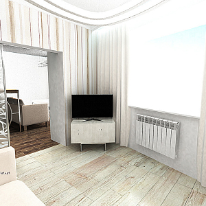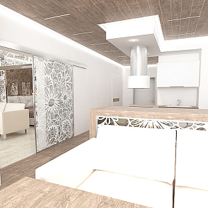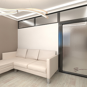 Интерьер с в деревянном доме, подсветкой настенной, подсветкой светодиодной, порогом, рейками с подсветкой и световыми линиями, проект «Лыжный пер. Квартира 58.3 м²» №18