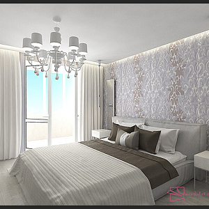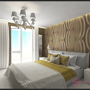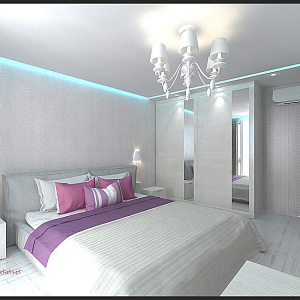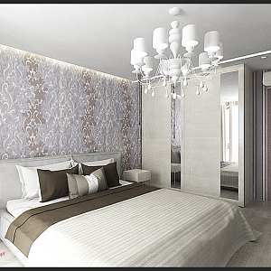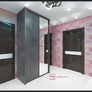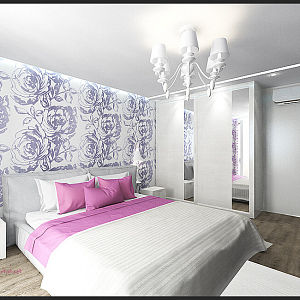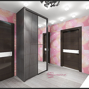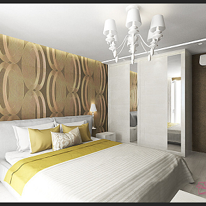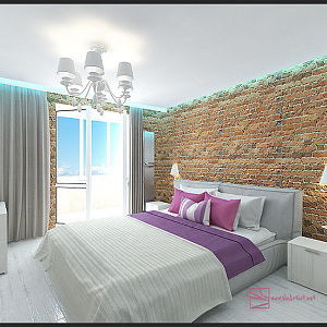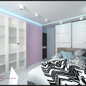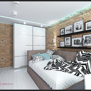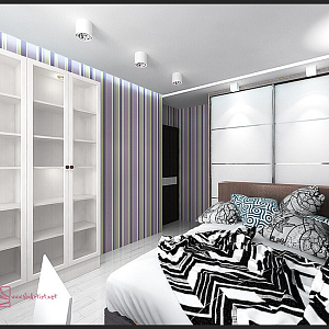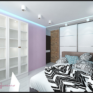 Интерьер с без дверей, гардеробной зой кроватью, гостиной-прихожей, зонированием, кроватью у двери, проходной, с антресолью, с детской, светильниками над кроватью, шкафом над кроватью, шкафом напротив кровати и шкафом у кровати в восточном стиле, в стиле №1