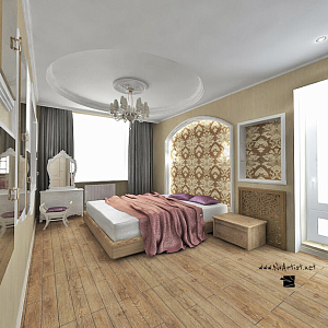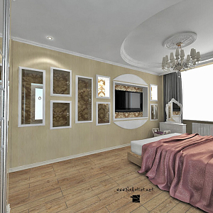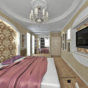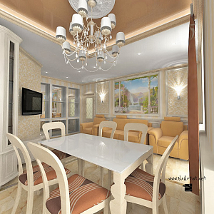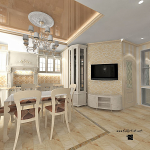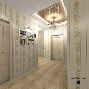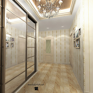Интерьер с open space, без дверей, гардеробной, гостиной-прихожей, зеркалом в нише, зоной ожидания для посетителей, зонированием, переговорной, перегородкой, проемом, проходной и с антресолью в классическом стиле, проект «Юбилейный квартал. Квартира 116м² №1