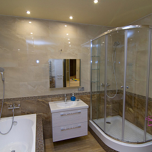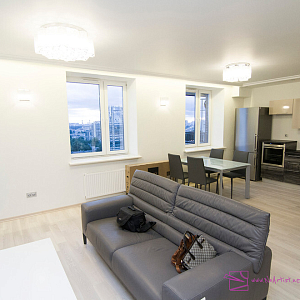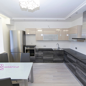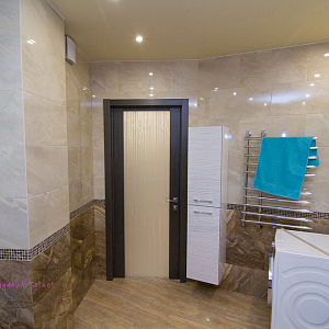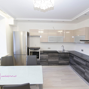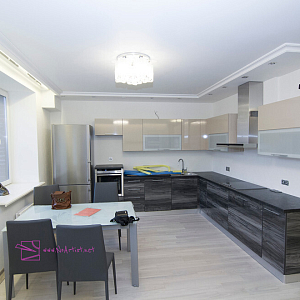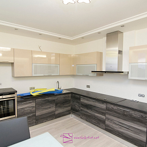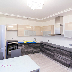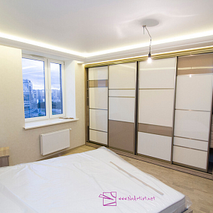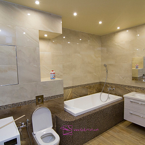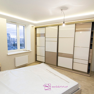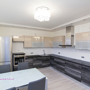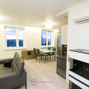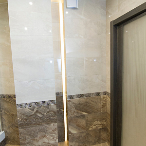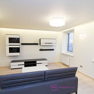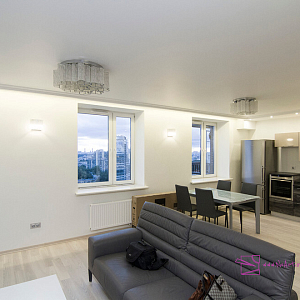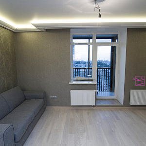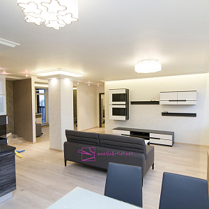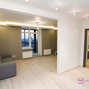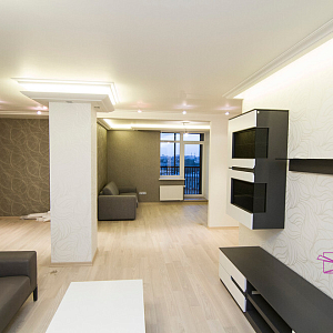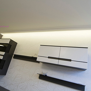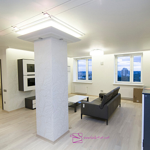 Интерьер гостиной с подсветкой настенной, подсветкой светодиодной, рейками с подсветкой, с подсветкой и световыми линиями, проект «Железнодорожный пер. Квартира 107м². №11