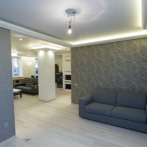 Интерьер с подсветкой настенной, подсветкой светодиодной, порогом, рейками с подсветкой, с подсветкой и световыми линиями, проект «Железнодорожный пер. Квартира 107м². №29