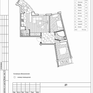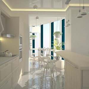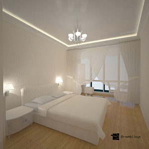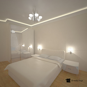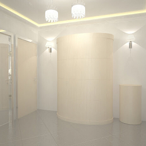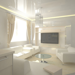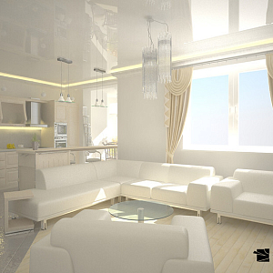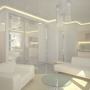 Интерьер гостиной с проходной, световыми линиями, подсветкой настенной, подсветкой светодиодной и с подсветкой в современном стиле, проект «Ул. Типанова. Квартира 79м²» №6