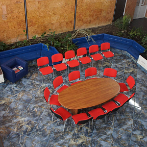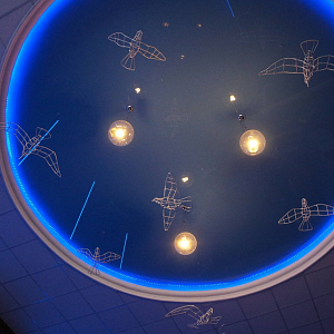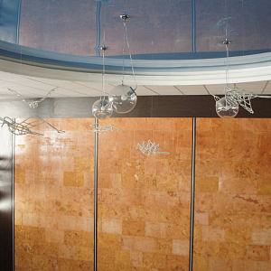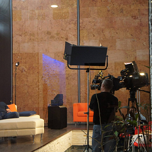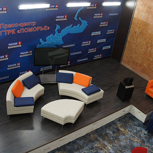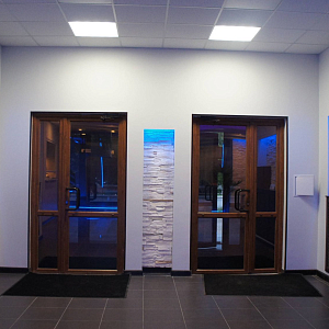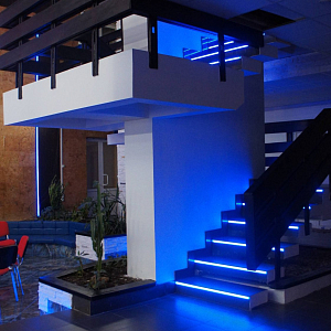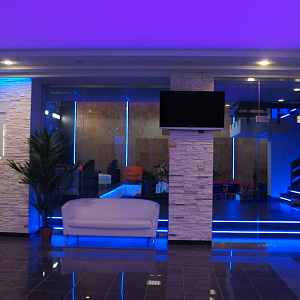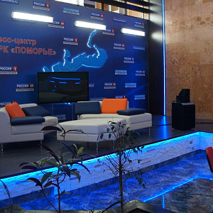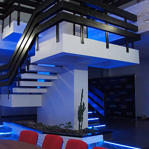 Интерьер с нишей с подсветкой, световыми линиями, рейками с подсветкой, подсветкой настенной, подсветкой светодиодной, подсветкой рабочей зоны и с подсветкой в современном стиле, проект «Холл и зимний сад Телевизионной компании» №6