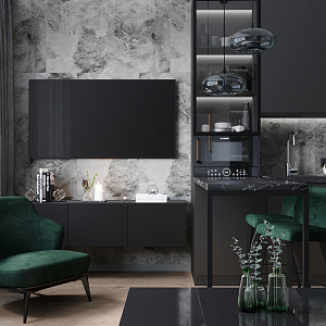 Интерьер спальни с кроватью в нише, кроватью у двери, бра над кроватью, светильниками над кроватью, шкафом над кроватью и шкафом напротив кровати, проект «ЖК Маяковский» №13