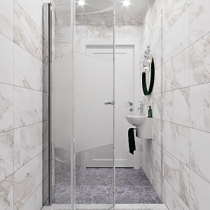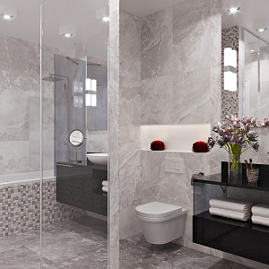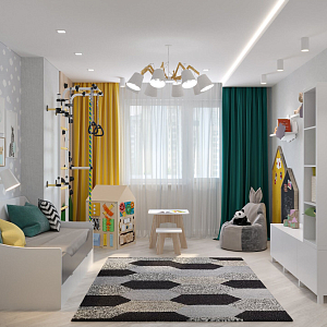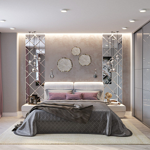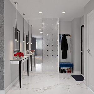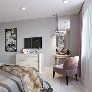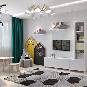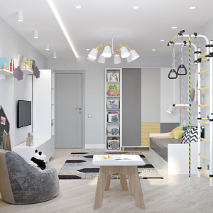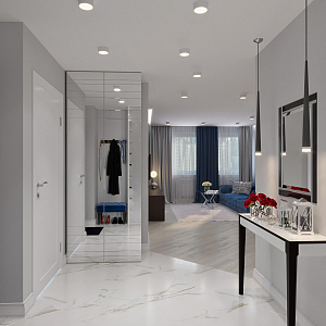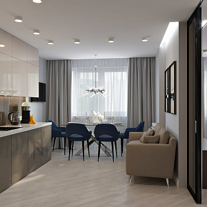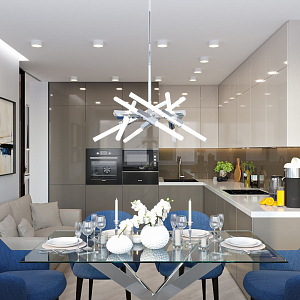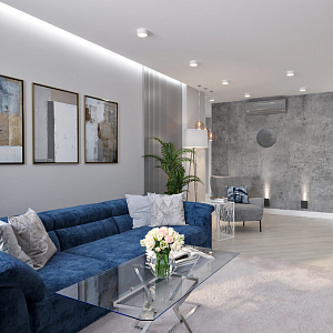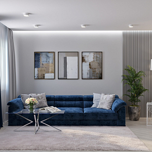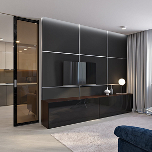 Интерьер гостиной с подсветкой настенной, подсветкой светодиодной, рейками с подсветкой и световыми линиями в современном стиле, проект «Квартира 95 кв. м на Парковой» №15