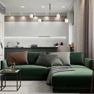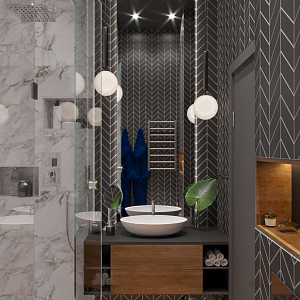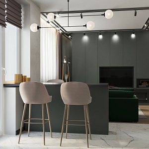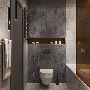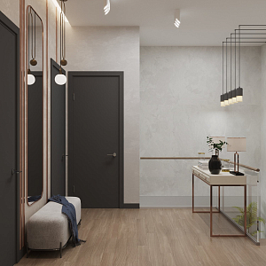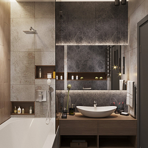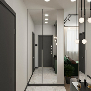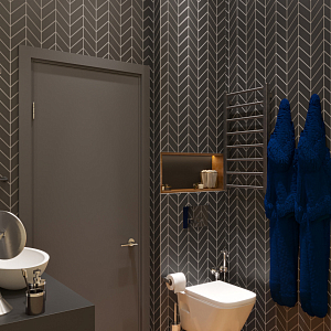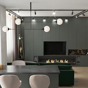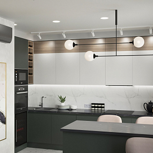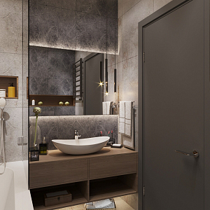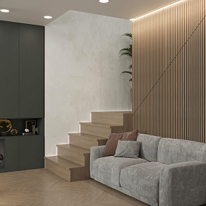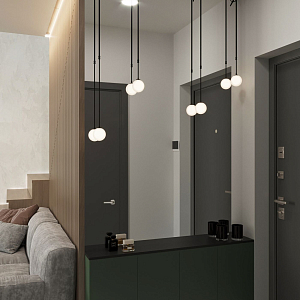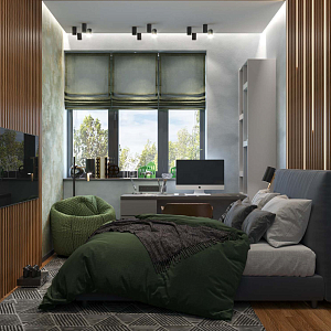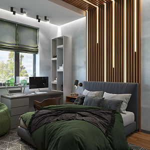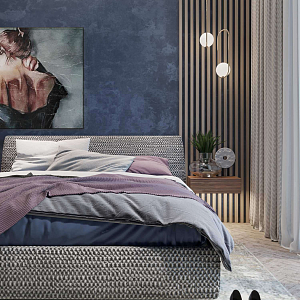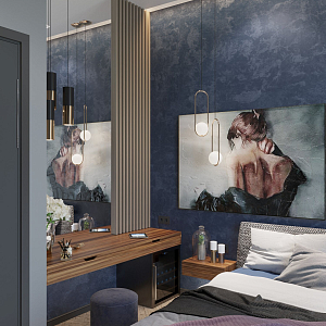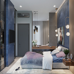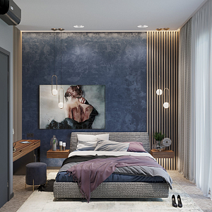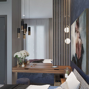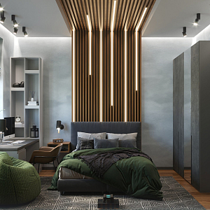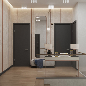 Интерьер спальни cветовыми линиями, подсветкой настенной, подсветкой светодиодной и светильниками над кроватью в современном стиле, проект «Двухуровневая квартира в Подольске» №14