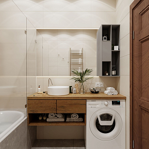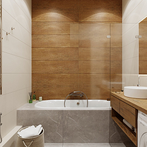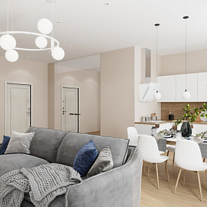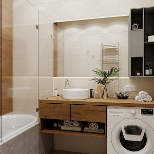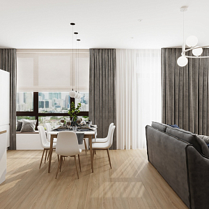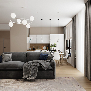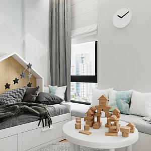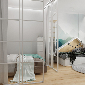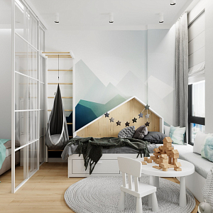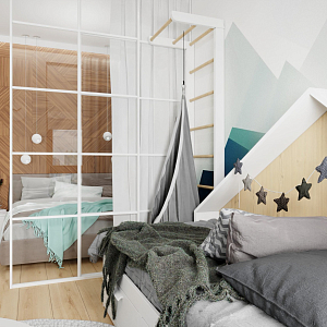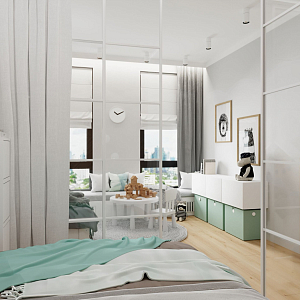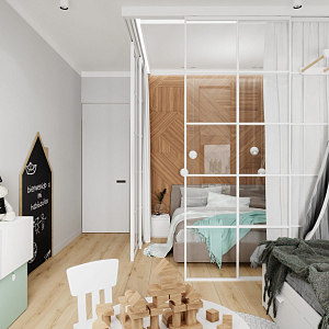 Интерьер гостиной с керамогранитом на стену с телевизором, панно за телевизором, стеной с телевизором, телевизором на рейках и телевизором на стене в современном стиле, проект «Спальня совмещенная с детской в Химках» №8