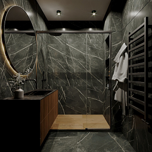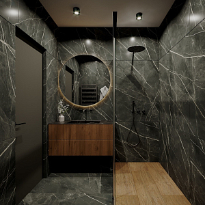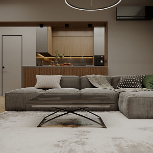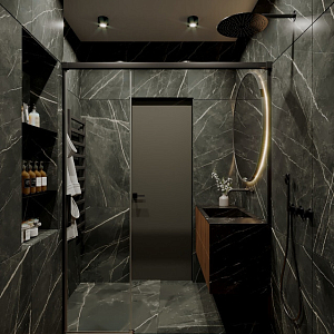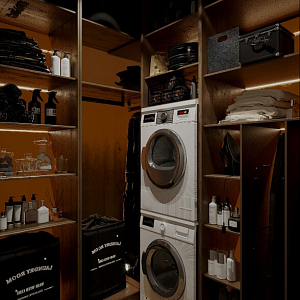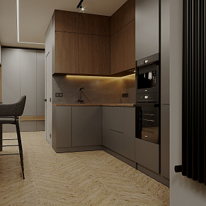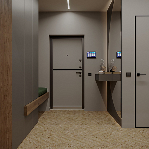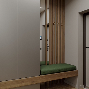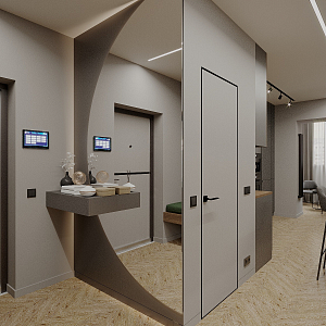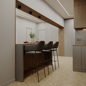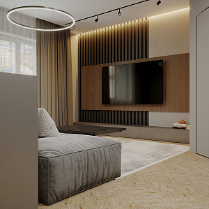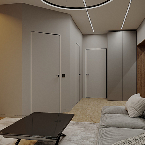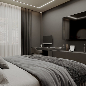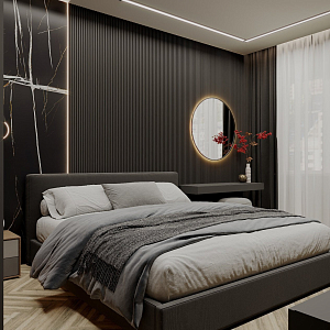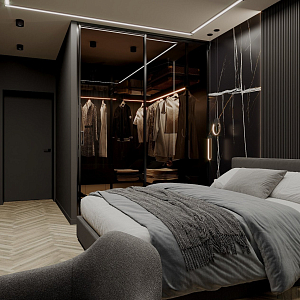 Интерьер спальни с нишей с подсветкой, световыми линиями, рейками с подсветкой, подсветкой настенной, подсветкой светодиодной, светильниками над кроватью и с подсветкой в современном стиле, проект «Дизайн 2-х комнатной квартиры 77 кв.м» №6