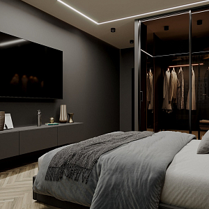 Интерьер спальни с бра над кроватью, подсветкой настенной, подсветкой светодиодной, рейками с подсветкой, с подсветкой, светильниками над кроватью и световыми линиями в стиле лофт и в современном стиле, проект «Дизайн 2-х комнатной квартиры 77 кв.м» №7