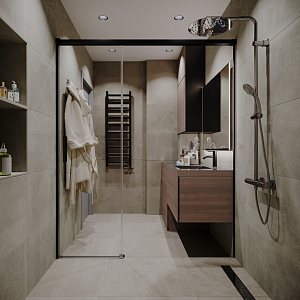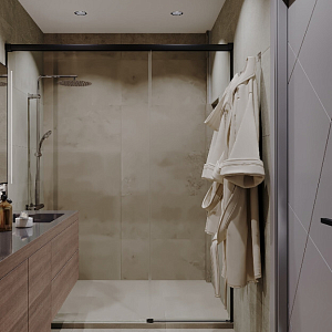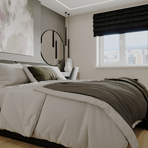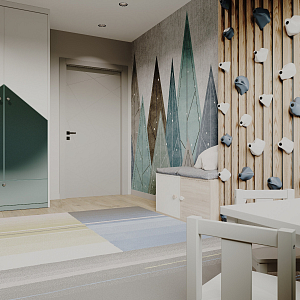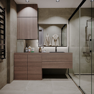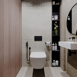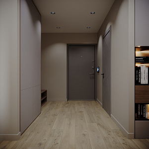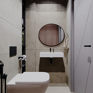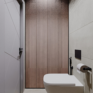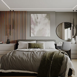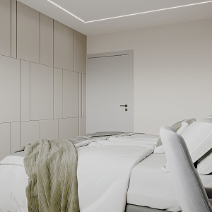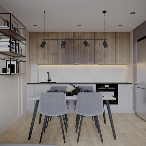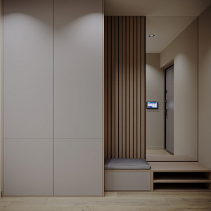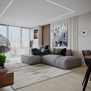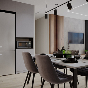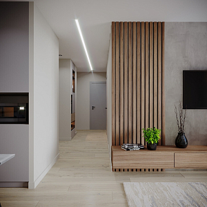 Интерьер гостиной с зонированием рейками, керамогранитом на стену с телевизором, панно за телевизором, подсветкой настенной, подсветкой светодиодной, рейками с подсветкой, световыми линиями и телевизором на рейках в стиле лофт и в современном стиле, проек №2