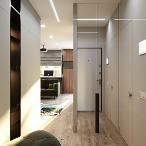 Интерьер гостиной c рабочим местом, световыми линиями, рейками с подсветкой, подсветкой настенной, подсветкой светодиодной и с подсветкой, проект «Дизайн проект однокомнатной квартиры 42 кв.м ЖК Панорама» №7