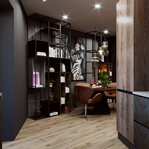 Интерьер кухни c рабочим местом, световыми линиями, вертикальными жалюзи, рейками с подсветкой, подсветкой настенной и подсветкой светодиодной в современном стиле, проект «Дизайн кухни-гостиной 23 кв.м» №5
