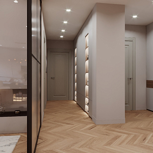 Интерьер спальни с панно за телевизором, стеной с телевизором, телевизором на стене, нишей для телевизора и керамогранитом на стену с телевизором в неоклассике, проект «Дизайн к3-х комнатной квартиры» №2