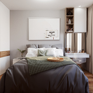 Интерьер спальни с зонированием рейками, панно за телевизором, телевизором на рейках, керамогранитом на стену с телевизором и рейками с подсветкой, проект «Дизайн проект квартиры 42 кв.м» №1