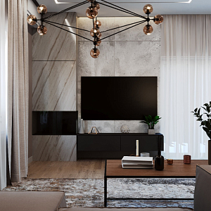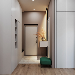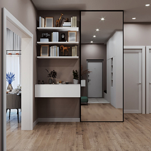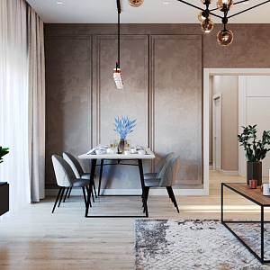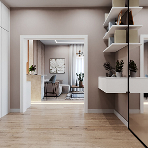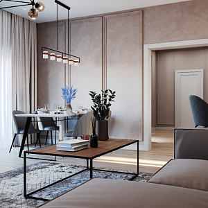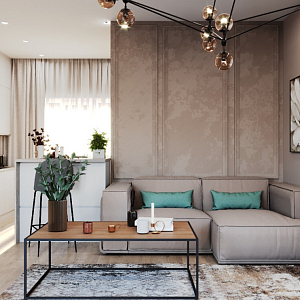 Интерьер кухни с нишей с подсветкой, световыми линиями, рейками с подсветкой, подсветкой настенной, подсветкой светодиодной и с подсветкой в неоклассике, проект «Дизайн кухни-гостиной 53 кв.м» №8