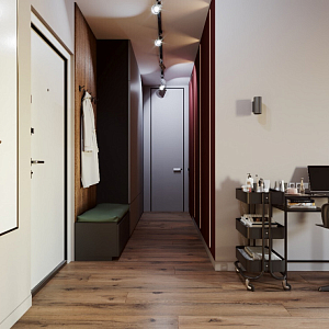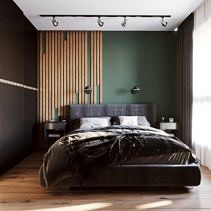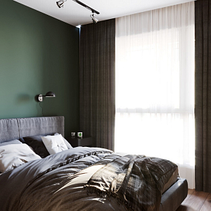 Интерьер спальни cветовыми линиями, подсветкой настенной и светильниками над кроватью в современном стиле и в стиле лофт, проект «Дизайн проект 2-х комнатной квартира 54 кв.м» №3