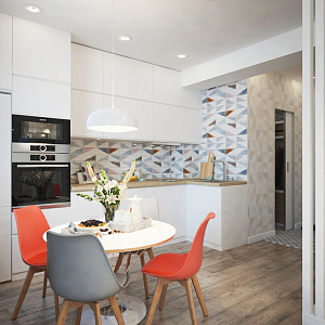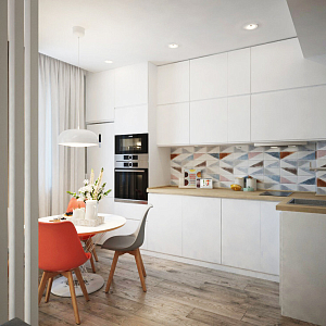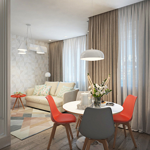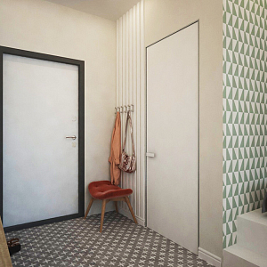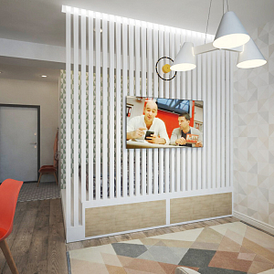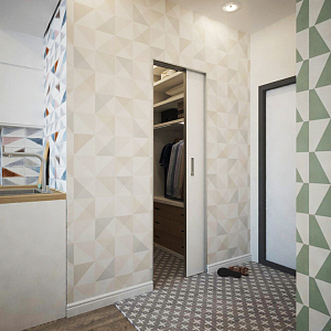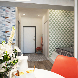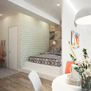 Интерьер спальни с бра над кроватью, зонированием, зонированием рейками, зонированием шторами, кроватью в нише, перегородкой и светильниками над кроватью в стиле лофт и в современном стиле, проект «Проект квартиры студии 28,4 кв.м г.Новороссийск» №9