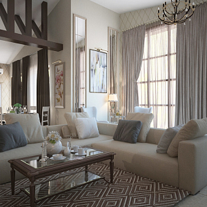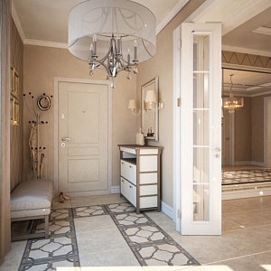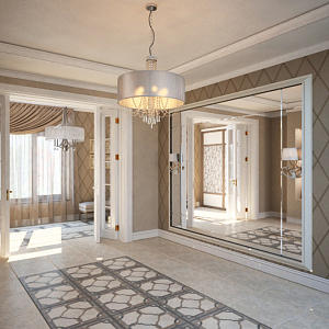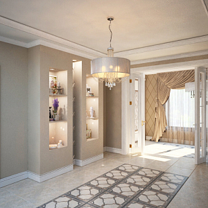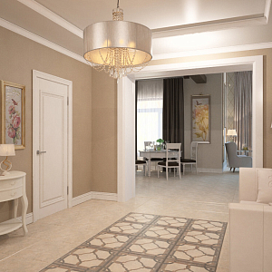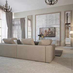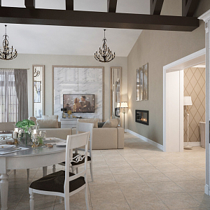 Интерьер гостиной с картинами над камином, панно за телевизором и керамогранитом на стену с телевизором в классическом стиле, проект «Проект частного дома г .Липецк» №2