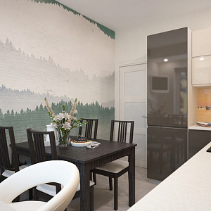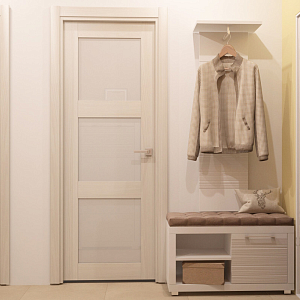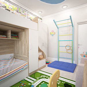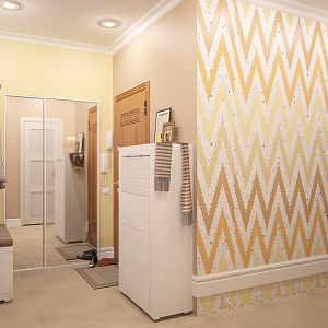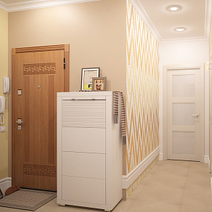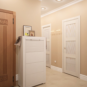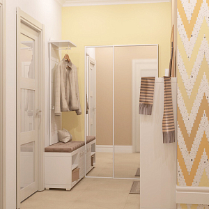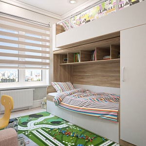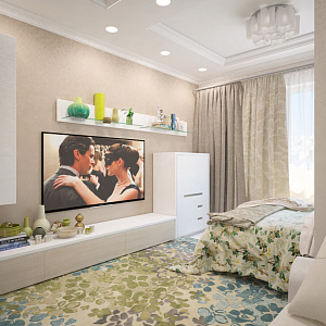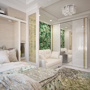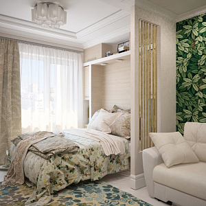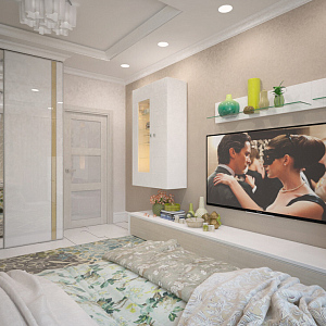 Интерьер спальни с кроватью в нише, кроватью между шкафами, кроватью под потолком, кроватью у двери, шкафом над кроватью, шкафом напротив кровати и шкафом у кровати в стиле лофт, неоклассике и эко, проект «Проект двухкомнатной квартиры 51 кв.м г.Балашиха» №19