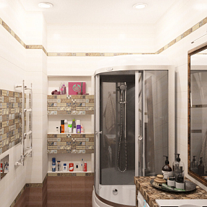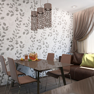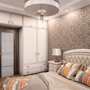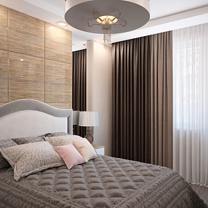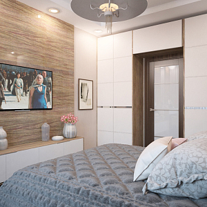 Интерьер спальни с керамогранитом на стену с телевизором, панно за телевизором, стеной с телевизором и телевизором на стене в современном стиле, проект «Дизайн проект 2-х комнатной квартиры 70 кв.м г. Радужный» №5