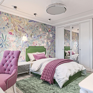 Интерьер спальни с керамогранитом на стену с телевизором, панно за телевизором и стеной с телевизором, проект «ЛЕТО» №21